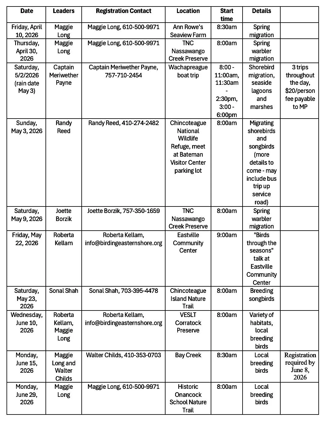 For more information: www.birdingeasternshore.org; info@birdingeasternshore.org